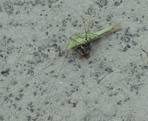 で、よくよく見ると、一頭の蜂がキリギリスを捕まえていた。
