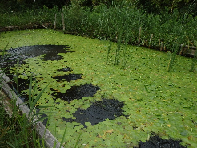 ガガブタの隙間から顔を覗かせている水の色、確認できた?