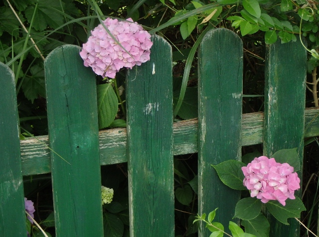 Fish村の塀の隙間から顔を覗かせているアジサイ、