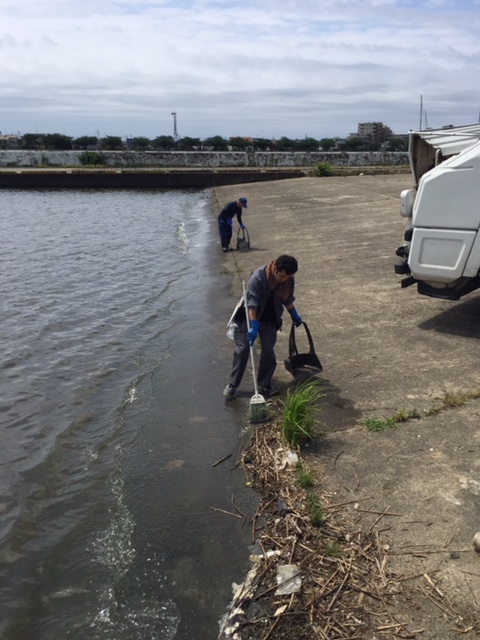 トーナメント会場として使わせてもらう土浦新港の清掃をしている。