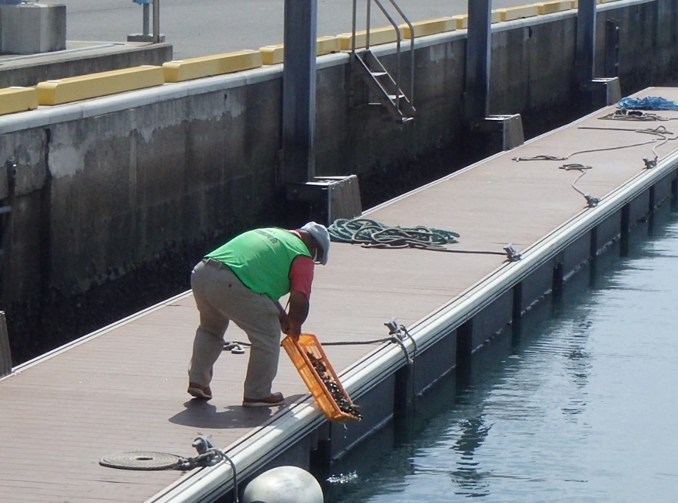水槽からザルに入れた魚を受け取ると、駆け足で桟橋まで降りて、