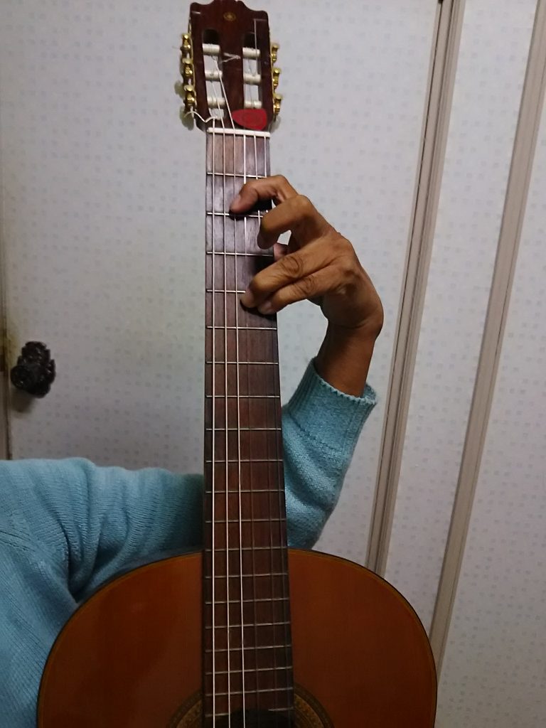 ギターをタテに持つと指が楽に広がります(曲の出だしの部分です)