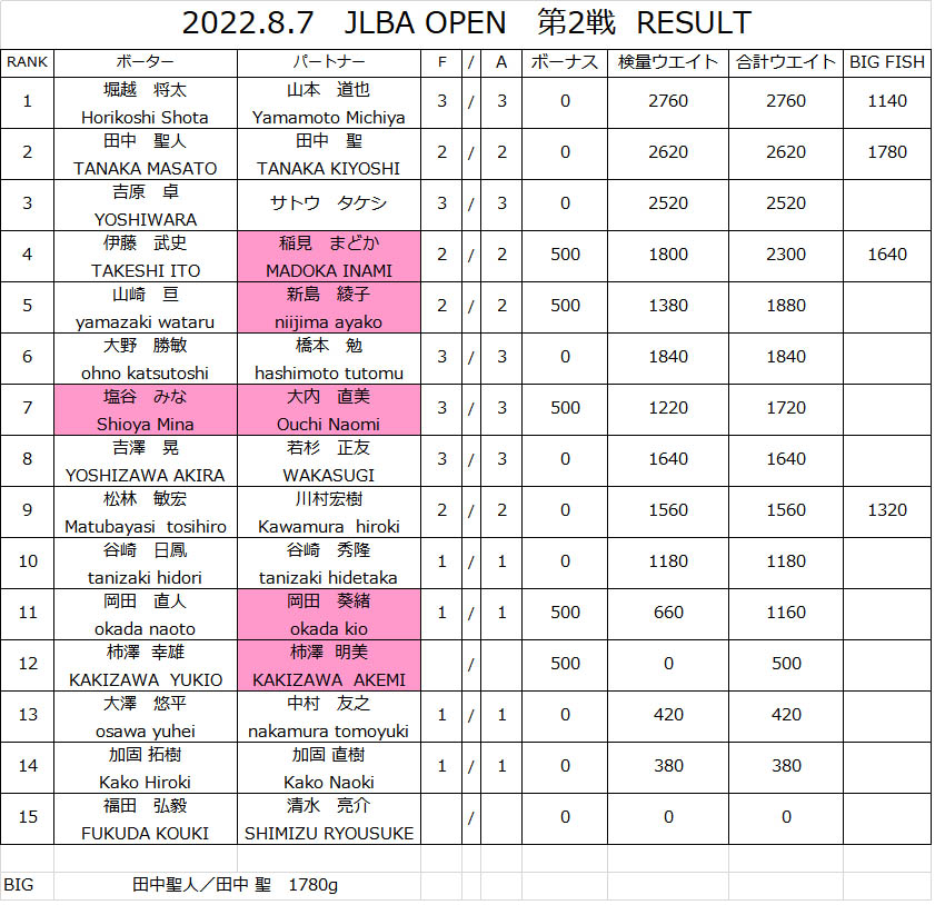 8/7 JLBA 第2戦 結果速報