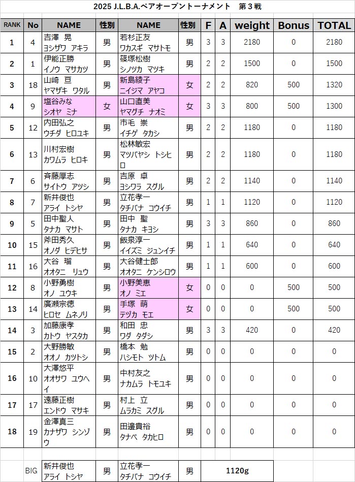 EVENTイベント HOME > TOPICS > EVENT > J.L.B.A. > J.L.B.A.第3戦 結果速報 2025.10.05 J.L.B.A. J.L.B.A.第3戦 結果速報 結果は以下の通りです。 また、今シーズンより年間ランキング、そして年間チャンピオンの表彰も行いました。 J.L.B.A. アングラーオブザイヤーは 山崎 亘氏、パートナーオブザイヤーは新島綾子さんに輝きました。 Back