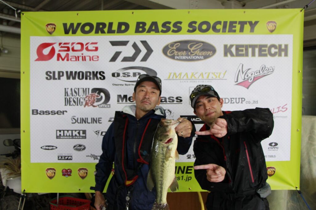 「下にくだるなかで、途中船が係留されている近くにアシがあり、そこに寄ってみました。カットテールのダウンショットをアシ際に落としてみたら、ロッドのティップが入って… それがいいサイズでした」と語る同チームでした。