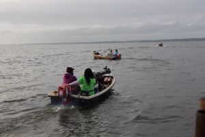 マルトボートを出て右手の桜川方面に向かうチーム、左手の境川方面に向かうチームなど、それぞれの思惑も搭載してボート勢いよく湖面を滑走した。