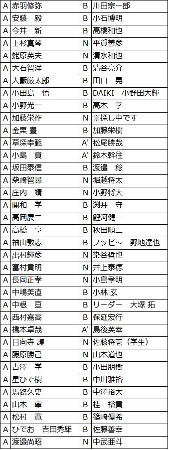 ●パートナーの連絡先を知りたい方は、本部までメールまたはメッセンジャー等にて、お問い合わせください(パートナーが「N」の選手は、Aプロから連絡をお願いします)。