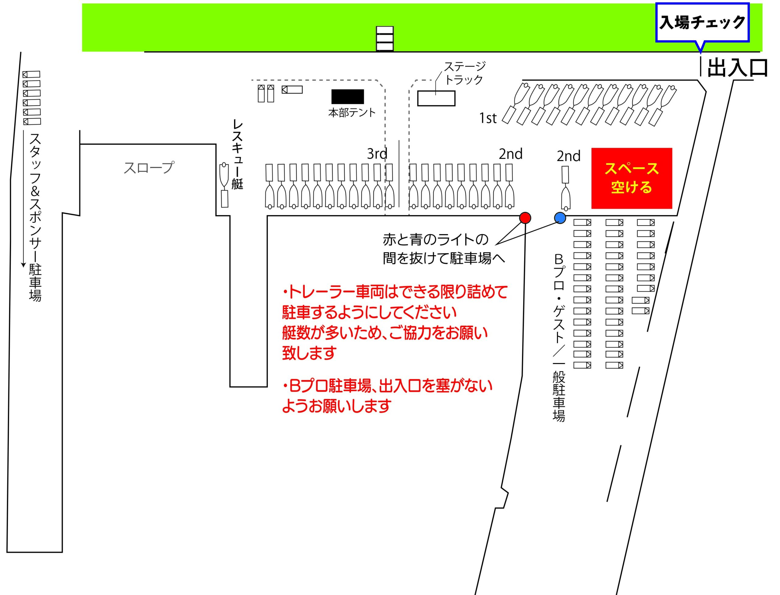 ●2日目はトレーラー駐艇位置も、2日目のフライト順・駐艇場所となりますので注意してください。(例:初日1stの場合、二日目は3rdの場所、2ndは変わらず、初日3rdは二日目1stの位置へ駐艇)