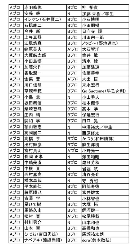 表は、Aプロの五十音順です。