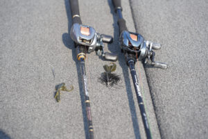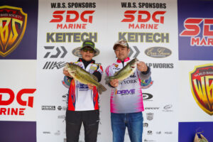 • 3位:高岡展二・周東将輝チーム 得意の本湖下流から桜川に戻ってキーパーを確保。橋脚にレッグワーム2.5の3.5gダウンショットを落とした周東選手が1055gをヒットさせた。手術から復帰初戦の高岡選手、嬉しい入賞である。