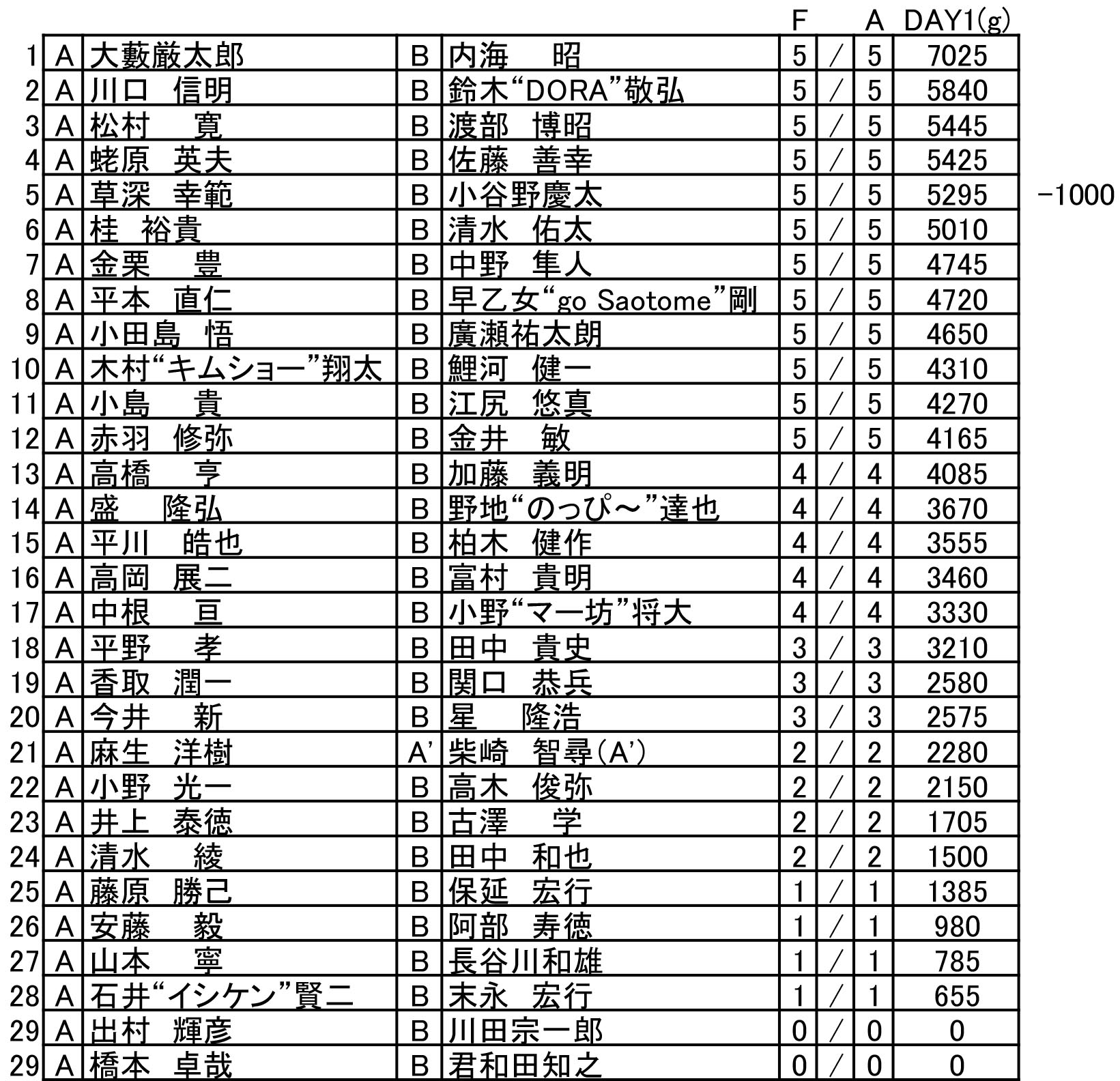草深チームは、パートナーの遅刻により1㎏マイナスとなっています。
