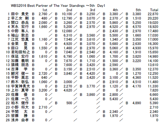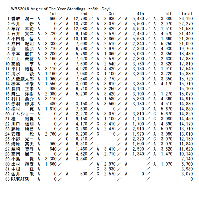 TOURNAMENTトーナメント HOME > TOPICS > TOURNAMENT > RESULT > WBS2016 5th 初日速報! 2016.09.17 RESULT WBS2016 5th 初日速報! 初日トップウエイトとなる5670gをウエイインした 松村/キムショーチーム。 Back