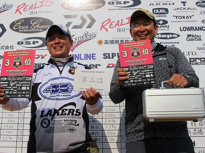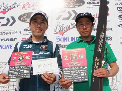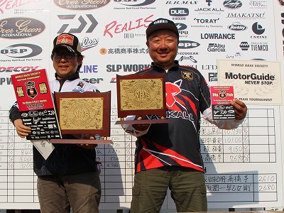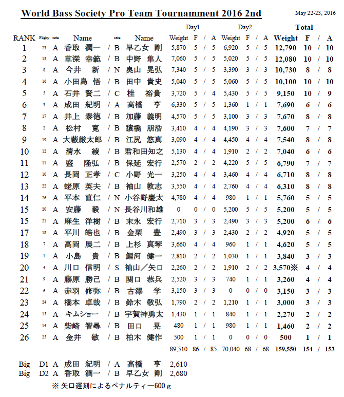 TOURNAMENTトーナメント HOME > TOPICS > TOURNAMENT > RESULT > WBS2016シリーズ 2nd 結果速報! 2016.05.22 RESULT WBS2016シリーズ 2nd 結果速報! 初日4位からの奇跡の大逆転! 優勝は香取 潤一/早乙女 剛チーム! 3位に入賞したのは初日7,340gでトップだったA今井 新/NB奥山晃弘チーム 2位は初日2位を維持する形となった草深幸範と今回がプロとしての 初参戦になる中野隼人選手のチーム 優勝は初日5,870gから最終日もこの日のトップウェイト6,920gを たたき出し逆転で優勝した。また二日目のビッグフィッシュ2,680g ビッグフィッシュ賞も獲得した。 詳細なレポートは後日の発表をお待ちください。 Back