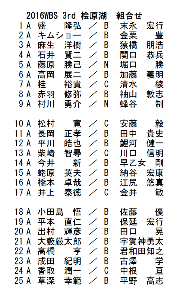 TOURNAMENTトーナメント HOME > TOPICS > TOURNAMENT > Information > 第3戦 桧原湖 組合せ発表 2016.06.28 TOURNAMENT 第3戦 桧原湖 組合せ発表 パートナーの連絡先は自分の氏名に知りたいパートナーの 氏名を添えてwbs@wbs1.jpまでメールでお問い合わせください。 以下はWBS第3戦桧原湖戦の駐車方法です。 矢印はウェイイン方法です。 プラクティスで早稲沢キャンプ場に行かれる方は 確認しておいてください。 ボーター/ノンボーターに関わらず毎年非牽引車両を トレーラーの駐車エリアに停める選手がいます。 警告処分の対象としますので注意してください。 Back