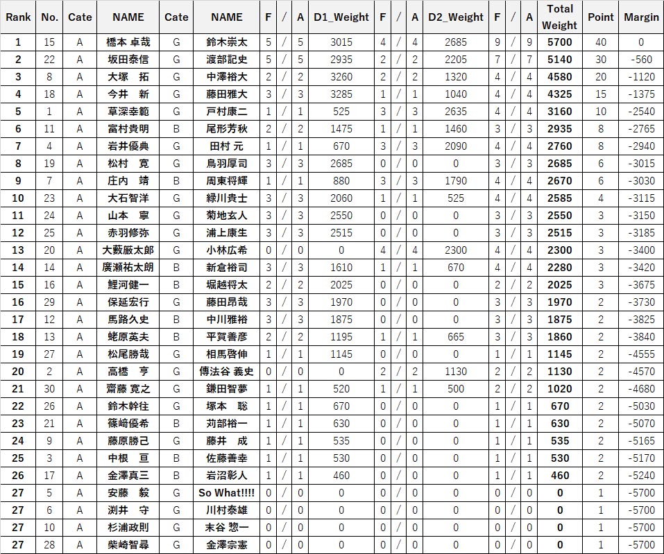 TOURNAMENTトーナメント HOME > TOPICS > TOURNAMENT > RESULT > WBSプロ第5戦 最終結果速報! 2025.09.21 RESULT WBSプロ第5戦 最終結果速報! 2025年9月20-21日、二日間にわたり開催されたWBSプロトーナメント第5戦の総合結果は以下の通りです。 Back